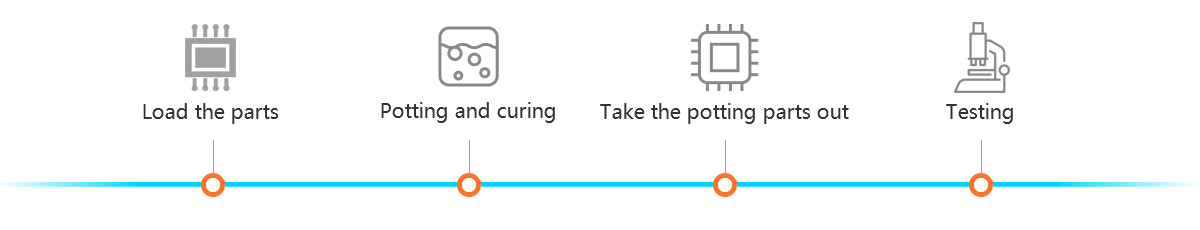 The two-component liquid silicon potting technology is widely used in the encapsulation of electronic components and other products to protect against moisture and shock. The product potting with two-component liquid silicon has good transparency, anti-tear strength, anti-shock performance, electric performance, waterproof performance, high and low temperature resistance performance and anti-aging performance.